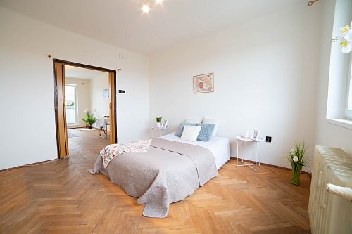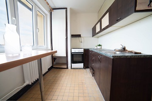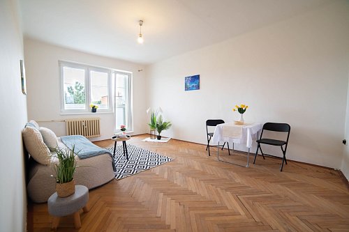 Byt je v původním stavu a čeká na rekonstrukci. Výhodou tedy je, že si ho můžete přizpůsobit přesně podle svých potřeb, vkusu, a hlavně finančních možností. Byt tvoří útulný obývací pokoj se vstupem na zasklenou lodžie, ložnice, malá kuchyn s oknem , koupelna s vanou, samostatné WC a chodba. K bytu náleží také sklepní kóje. Na podlahách v pokojích jsou dřevěné parkety, které dodávají interiéru příjemnou atmosféru.